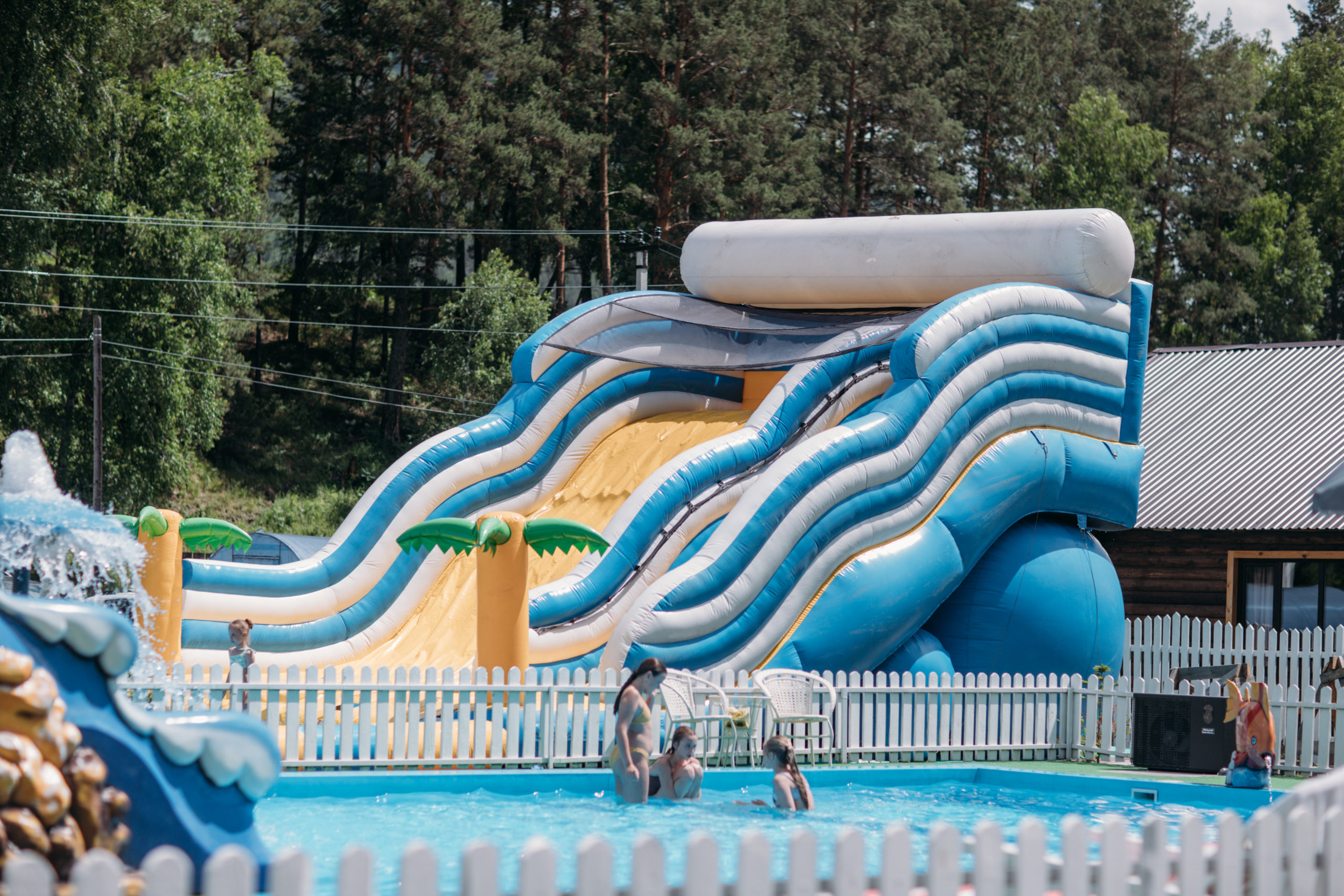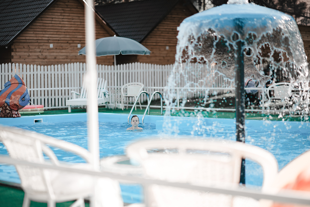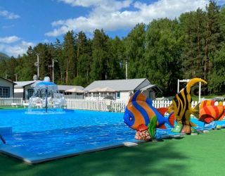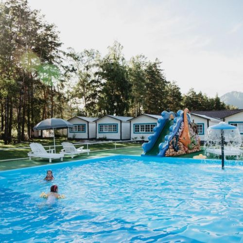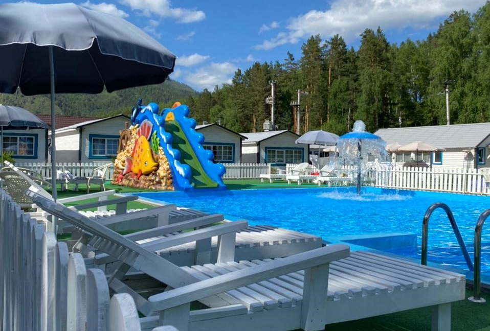 - пользование открытым летним бассейном, аквагоркой, шезлонгами и зонтами
